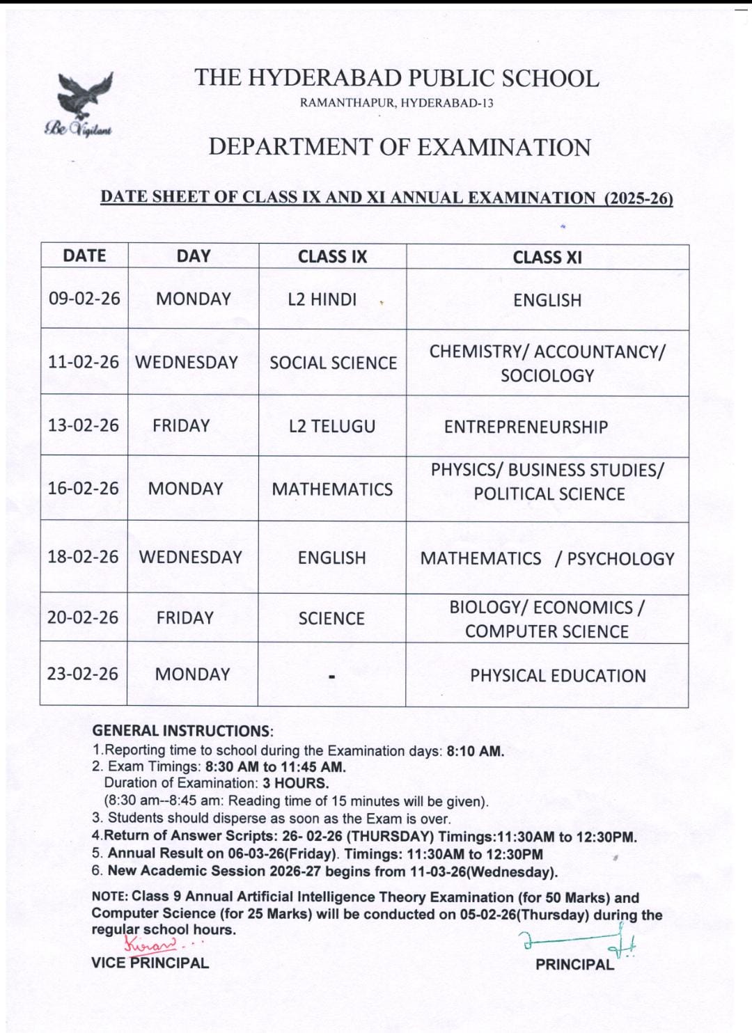 | Time table for Annual Examination for classes 1 to 9 and Class 11 commences from 20th February 2023 |